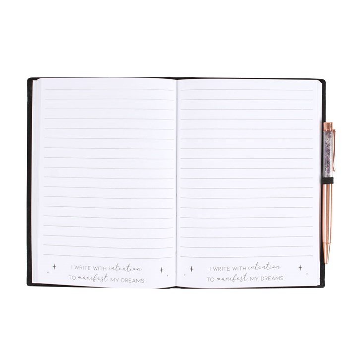 Eleva tu práctica creativa y espiritual con el Diario de Manifestación con Pluma Amatista 💫📖. Su cubierta de terciopelo negro aporta presencia y tacto suave, mientras que las páginas rayadas integran el mensaje inspirador “Escribo con la intención de manifestar mis sueños” para mantener el foco en cada sesión. La pluma a juego contiene cristales de amatista, mineral asociado simbólicamente con claridad e intuición 💜.