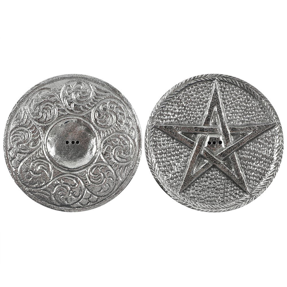 Eleva tu ritual con el Porta incienso con pentagrama de plata de 10 cm ✨⭐. Su diseño plateado luce un pentagrama grabado con espirales y puntos, y es multiuso: en la parte posterior puedes quemar conos, y en la placa frontal tienes orificios para hasta 3 varillas. práctico y decorativo incluso sin uso, fácil de limpiar y listo para regalar 🎁.