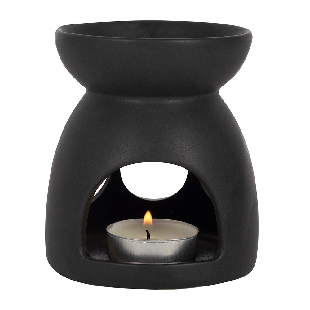 Invoca la energía lunar con este quemador de aceite de triple luna negra, elaborado en cerámica mate con un diseño recortado que deja pasar la luz creando un aura de calma y poder 🌙🔥.