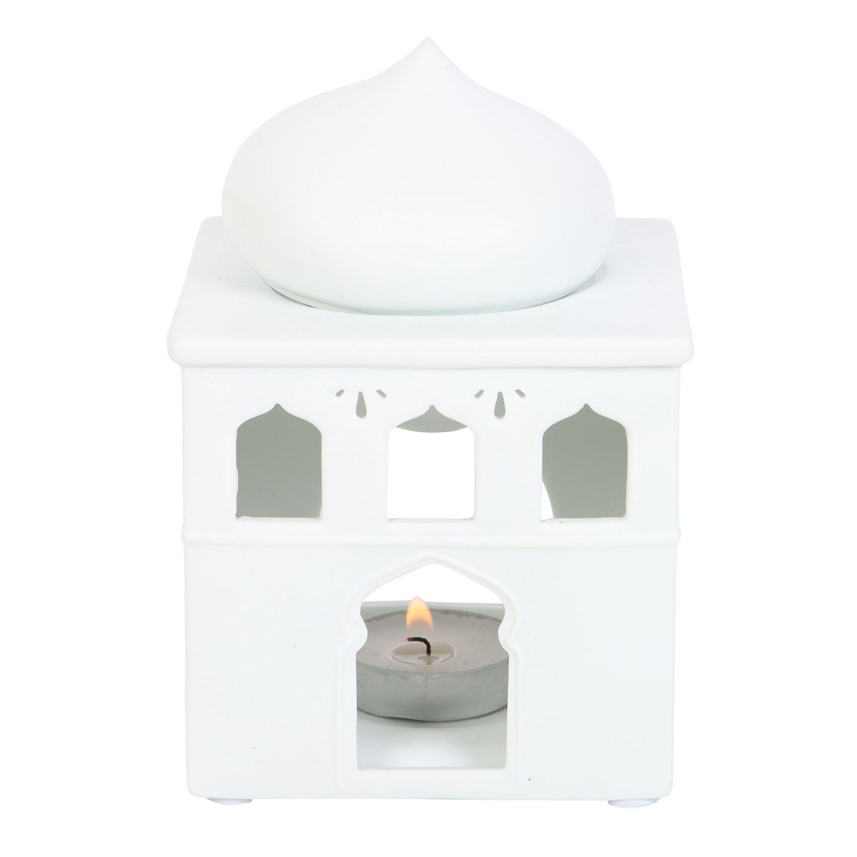Un elegante quemador con forma de mezquita en color blanco roto que perfuma el hogar mientras proyecta una cálida luz decorativa.