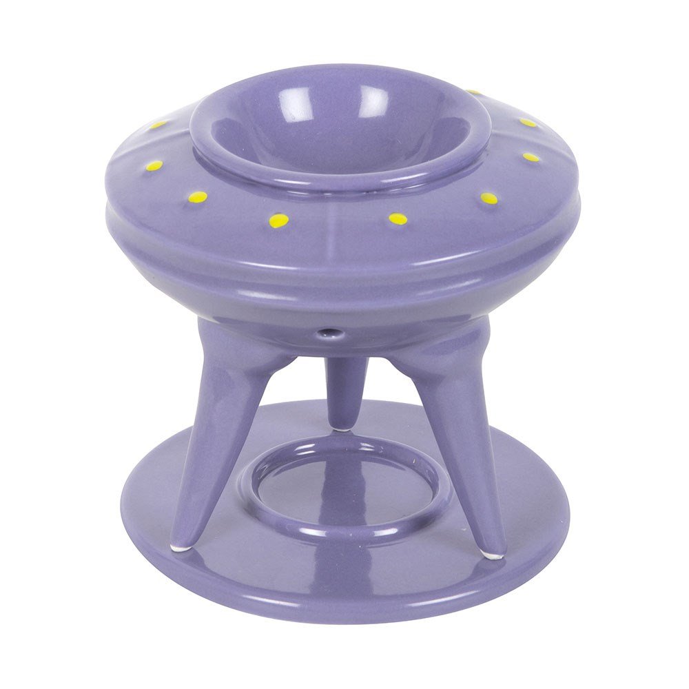 Quemador de cera con forma de OVNI en color morado, ideal para wax melts y aceites aromáticos, con un diseño divertido de inspiración espacial. 👽🕯️
